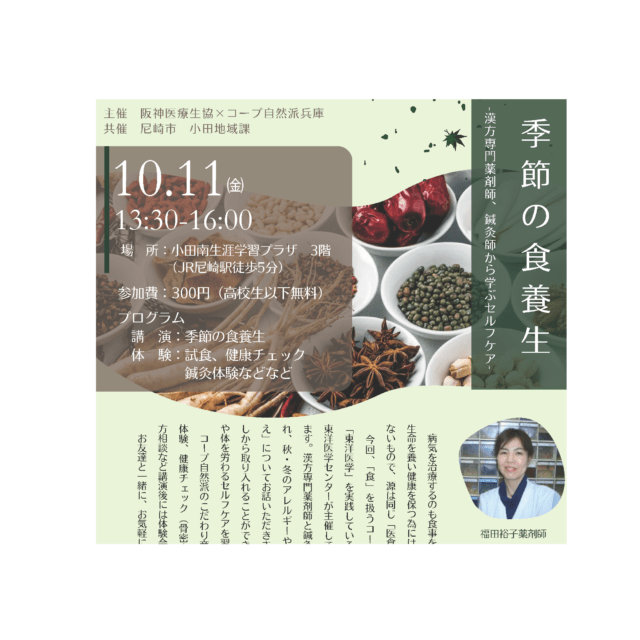 尼崎を拠点に保険、医療、介護、福祉などくらしを支える「阪神医療生協」とのコラボ企画。東洋医学センターの先生方から、夏の疲れ、秋のアレルギーなどへの備えをお話いただきます。日々のくらしから取り入れることができる食材選びやセルフケアを習得しましょう!試食や鍼灸体験、健康チェック(骨密度、体組成など)、漢方相談コーナーもあります♪
