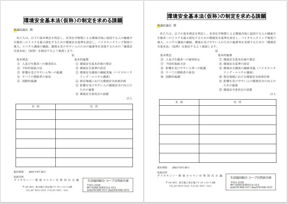 請願署名は衆議院議長宛と参議院議長宛、2つの文書への署名が必要です。