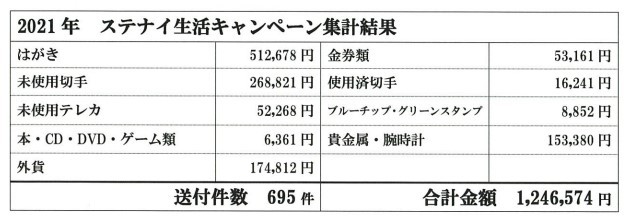 この度は、シャプラニールの物品寄付活動「ステナイ生活」にご協力いただき本当にありがとうございます。2021年5月末までに実施した、ステナイ生活キャンペーンへの寄付物品について、仕分けと集計の作業が完了しましたのでご報告差し上げます。当会の活動へ温かなご協力を賜り、心より感謝申し上げます。南アジアでの活動資金として大切に活用させていただきます。今後とも末永く、どうぞよろしくお願い申し上げます。