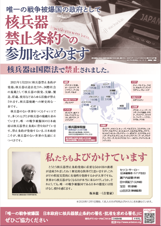 禁止条約が発効するいま、日本が、核兵器禁止条約に参加すべきとの声を上げていきましょう。みなさまのご協力をお願いいたします。