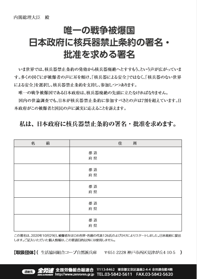◆「唯一の戦争被爆国 日本政府に核兵器禁止条約の署名・批准を求める署名」のご協力をありがとうございました。