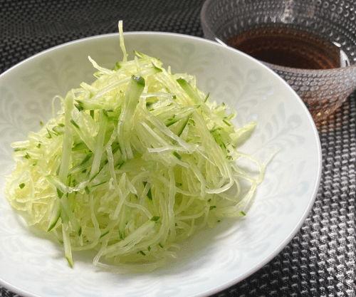 ②千切りしたきゅうりと①を和え、めんつゆを添える。