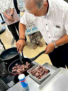 試食の時間では、家庭でも実践できる硬くならずに肉汁をしっかりと閉じ込めてお肉を焼く方法を実演していただきました。
