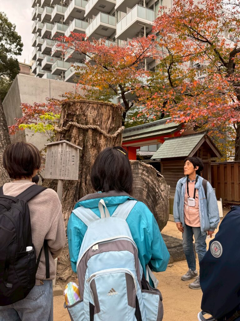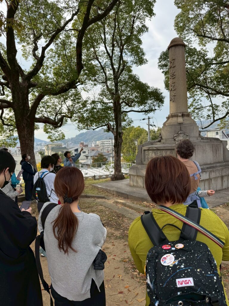 神戸に住む方々(特に子どもたち)に神戸で起きた80年前の大空襲を共に学び、平和の維持のために空襲の跡が残る場所をめぐりました。 小さなお子さんから小学生・大学院生・大人の方までたくさんの方々が参加され、神戸空襲を記録する会の小城先生のお話をじっくり耳を傾けられていました。戦跡が載っている平和マップを手に持って、今回は神戸駅から大倉山公園にある「いのちと平和の碑」へ赴き、犠牲者への追悼と平和への誓いを新たにしました。六宮神社と八宮神社では、 焼夷弾の落下跡や火災の痕跡を直接確認しました。神戸教会や兵庫県公館で当時の写真を見せてもらいながら当時の被害の大きさを学びました。最後には、生田神社の境内にある「生田の森」の中で、今も幹に黒い焦げ跡が残る「戦災樹木」がある所を教えてもらい、戦争について改めて色々と考えさせられました。80年経った今、街の景色は美しく復興していますが、静かに佇む戦跡や木々の焦げ跡は、当時の記憶を私たちに無言で語りかけています。 今回、小城先生から案内とお話いただいた貴重な時間は、単なる歴史の学習ではありませんでした。それは、あの日起きた悲劇を『過去の出来事』で終わらせず、自分たちの住む街の物語として受け継ぐ大切な一歩となりました。焦げ跡を残しながらも力強く生きる生田の森の木々のように、私たちもまた、平和の尊さを心に刻み、次の世代へとこの記憶を繋ぎ続けていかなければならないと強く感じています。来年度も神戸空襲の戦跡めぐりが企画できたらなと思っています。報告者:バーク華苗